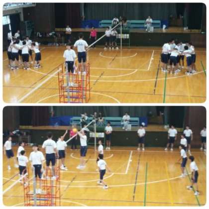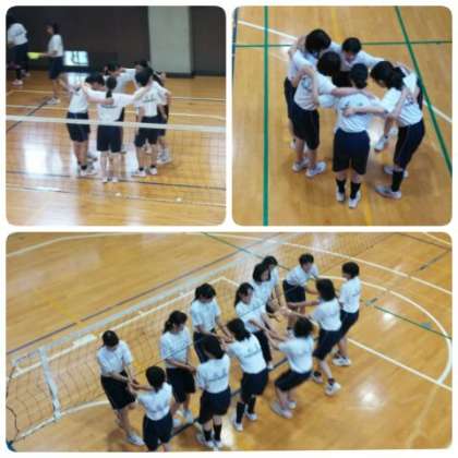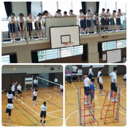各チーム、挨拶のあとコートで円陣を組み、気合を入れて試合に臨んでいました。審判や記録もすべて生徒により行われ、先生は補助役と応援です。体育館が狭いので、応援は2階からです。保護者の皆様には、舞台の上から観戦していただいています。