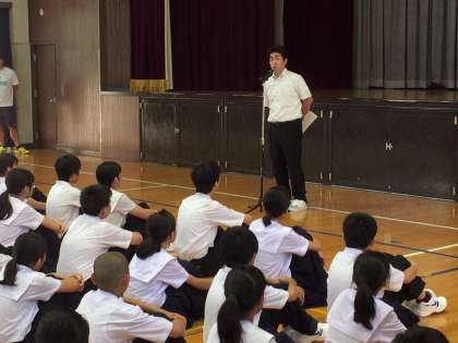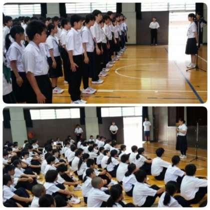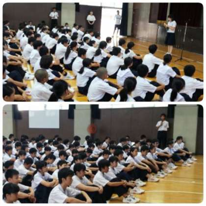 始めに学校長から、大阪北部地震や週末の豪雨による自然災害について話があり、身近に災害が起きた時、一人ひとりがどのような行動をとればいいにだろうか、また、学校が避難所となった時に家族や地域のために、中学生としてどのような行動をとればいいのだろうか考えてみようと話をしました。また、先週実施した「学校生活振り返りアンケート」の結果から、自分自身の1学期の学校生活を振り返り、学習の結果と合わせて学期末懇談で、保護者、担任に先生とよく話し、これからの学校生活に活かしていこうと話をしました。