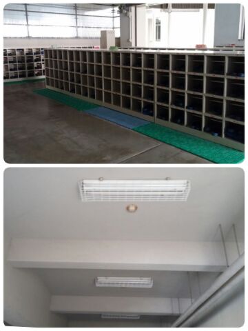 ピロティー・天井の蛍光灯カバーも、都島区近隣校の管理作業員さんの協力により汚れやサビを落とし、きれいに塗装していただきました。