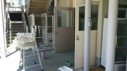 今日も管理作業員さんにより、保健室前の扉を塗装をしていただいています。