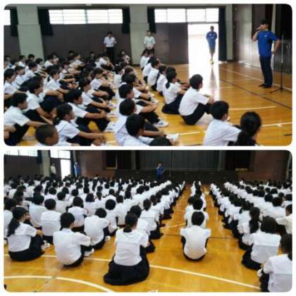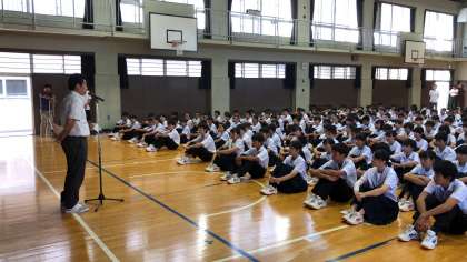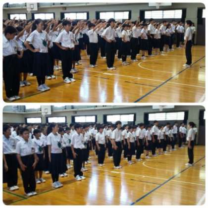 学校長に続いて、教務主任の川西先生から、台風21号の影響に伴う「3年生 チャレンジテストの延期について」「授業変更についてのお知らせ」「台風21号接近に伴う措置のお知らせ」について、話がありました。