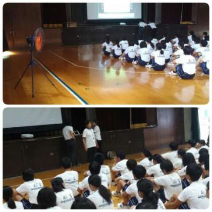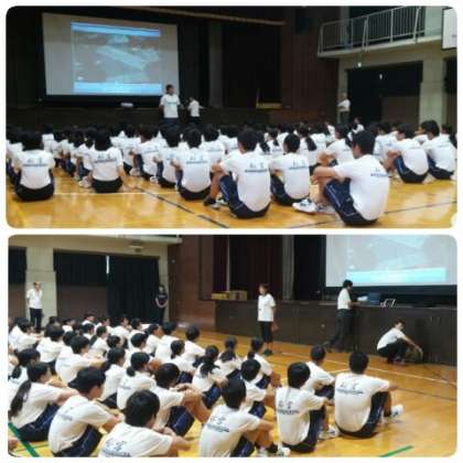 9月7日(金)5時間目、3年生は体育館に集まり、9月28日(金)の体育大会で集団演技として披露する「集団行動」の練習に取り組み始めました。