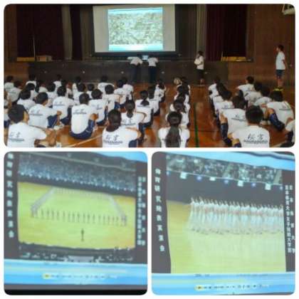 始めに、集団行動のDVDを観て、集団行動の意義と目的を確認し、自分たちが演技するイメージづくりに取り組みました。