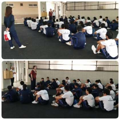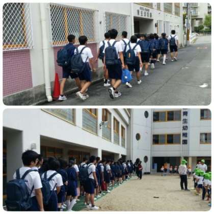 出発前にピロティーで家庭科・仲原先生から事前指導を受け、育成幼稚園に向け出発しました。