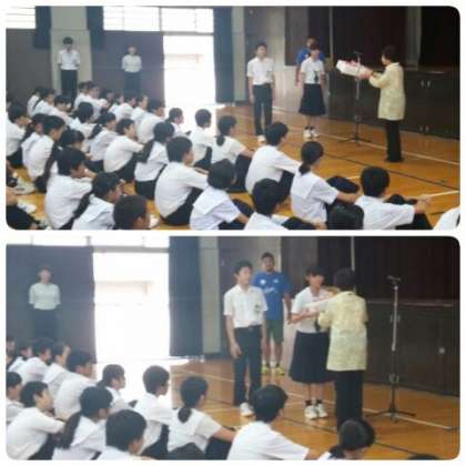 本校同窓会会長であり、NPO法人フレッシュケアーアソシエーション理事長でもあられる松下喜代子様から、本校生徒会の代表に防犯ベルを手渡していただきました。生徒会会長からはお礼の言葉、松下様からも防犯ベルの利用についてお話をいただくとともに、子どもたちへの激励の言葉をかけていただきました。