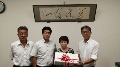 写真下は、本日の全校集会に先立って行われた贈呈式の様子です。本校校長室において、松下様から森PTA会長、吉江校長に防犯ベルが贈呈されました。