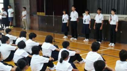 今日の全校集会の司会は、後期生徒会・学級委員会の認証式を行うため、選挙管理委員会代表の2年生が務めました。