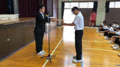 認証式を終えて、水泳部の名倉君に大阪府学年別水泳大会の表彰伝達が行われました。