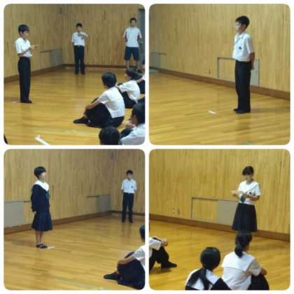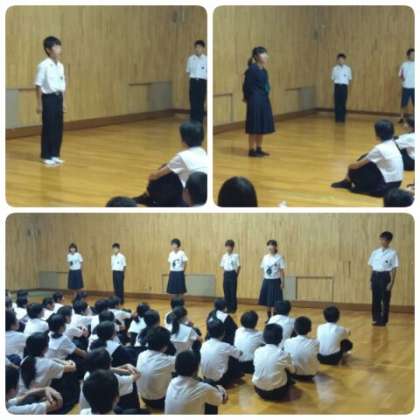 後期学級委員長を中心に行われる最初の学年集会です。各クラスの委員長が、教室からの移動、集合、整列、進行と、全てを子どもたちで運営する学年集会です。