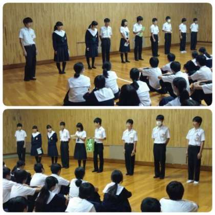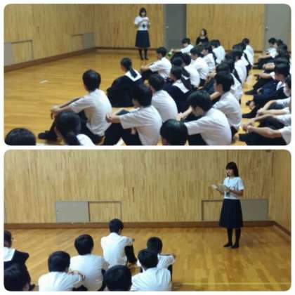 続いて、10月1日(月)に行われた専門委員会の報告が各委員の代表から行われ、最後に、各クラスの男女委員長からクラスの目標等について話がありました。