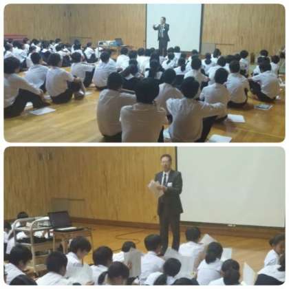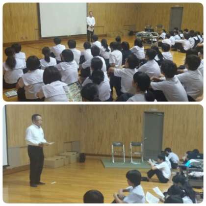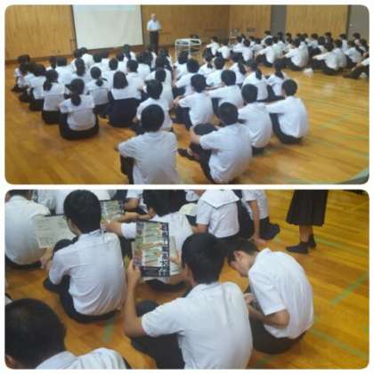 続いて、大阪産業大学附属高等学校の入試対策室長・前川俊樹先生から、私立高校の特徴についてお話をしていただいた後、学習カレンダーをいただき、高校入試に向けた計画的な学習の必要性、苦手教科に対する取組の必要性について話していただきました。最後に、入試は団体戦、桜中生みんなで協力して乗り越えていくことの大切さ、家族の人と一緒に力を合わせて乗り越えていく大切さについて教えていただきました。