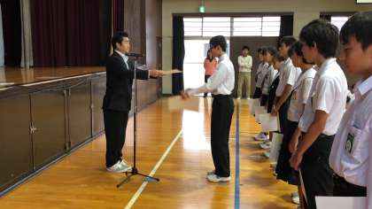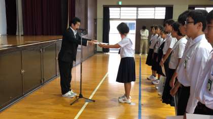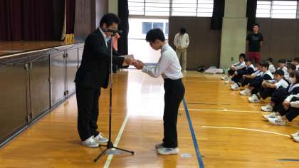 始めに、第37回スポーツフェスタ2018卓球の部で3位に入賞した藤原和輝君に学校長からメダルが授与されました。続いて、大阪市第2ブロック水泳競技大会で入賞した水泳部員に表彰状が授与されました。