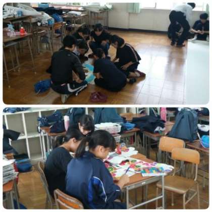 5・6時間目は、それぞれのチームに分かれて取り組んでいました。書道パフォーマンスチームは、作品の周囲を飾るデコレンションづくりに取り組んでいました。