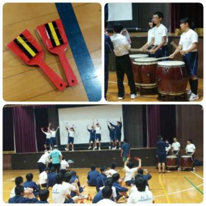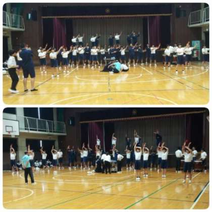 放課後、よさこい踊りチームは、初めて鳴子を使い、体育館舞台、舞台前のスペースを使って通し練習に取り組んでいました。よさこい曲に、太鼓、鳴子の音が響き、迫力のあるよさこい踊りになってきました。