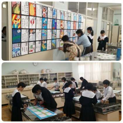 この間取り組んできた「カルタ」が完成し、クラスごとに東館1階「調理室」で展示作業に取り組んでいました。クラステーマ「1組…大阪」「2組…平和」「3組…友情」を味わっていただき、子どもたちが考えた五・七・五の読み札の文章と絵札の取り合わせを楽しんでください。また、12時半からは体育館で舞台発表「朗読劇」の練習に大きな声で取り組んでいました。