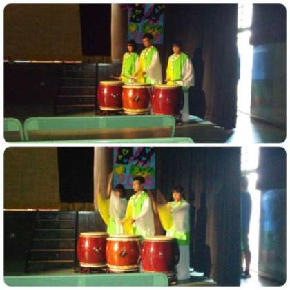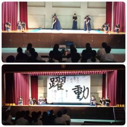 和太鼓の演奏で3年の発表が始まります。続いて書道パフォーマンスです。