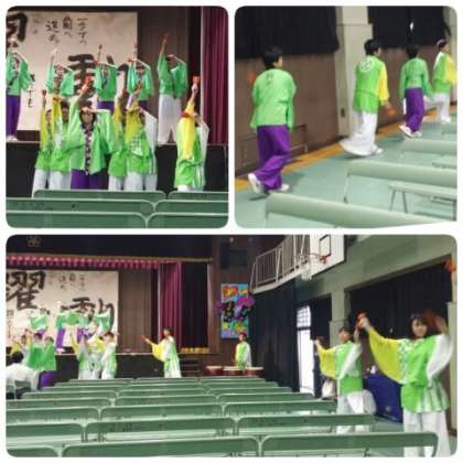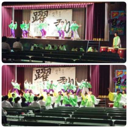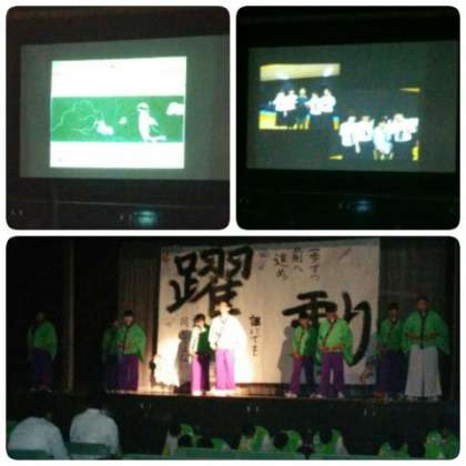 書道パフォーマンスに続いて、黒板アートの映像、よさこい踊りに取り組んだ経緯を修学旅行での写真の映像を流しながら、よさこい踊りが始まりました。
