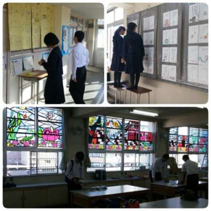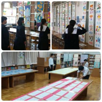 教科、部活動など、担当の子どもたちが展示作業に取り組んでいます。