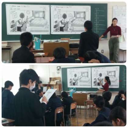 2枚の絵を見ながら、先生の出す問題に班対抗で答えていきます。順番に各班の代表がホワイトボードに解答を書いて答えていきますが、班で話し合って解答を出している場面もあり、楽しそうに英語の授業に取り組んでいました。」