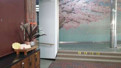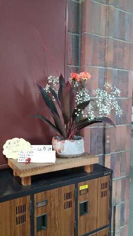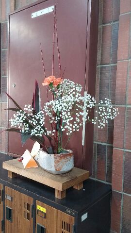 茶華道部の子どもたちが、サンゴミズキ、カーネーション、ドラセナ、カスミ草を使って「いけばな」の作品づくりに取り組み、玄関に飾ってくれています。