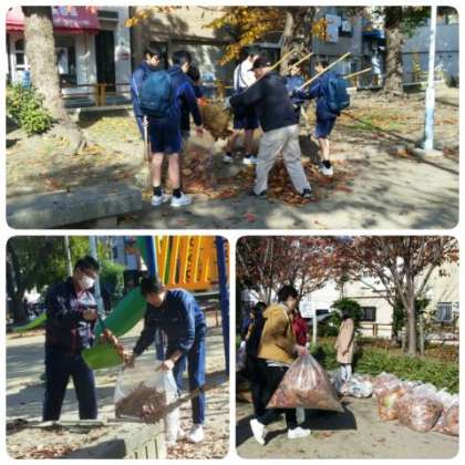 熊手や竹箒を使い公園内いっぱいの落ち葉を集めました。ハサミを持った人は空き缶や紙くず、たばこの吸い殻などを集めていきました。