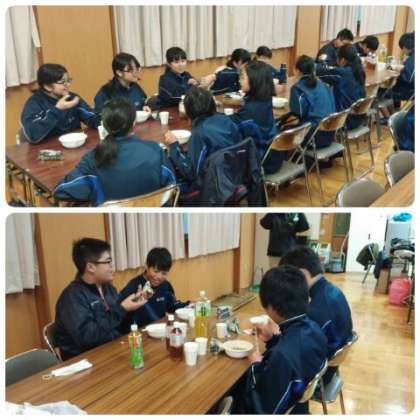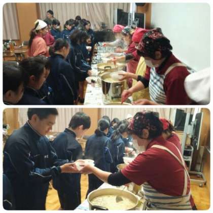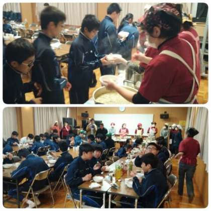 PTA役員・実行委員の皆さんが準備していただいた豚汁うどんとおにぎりを、クリーン活動に参加した全員でいただきました。