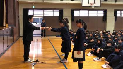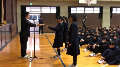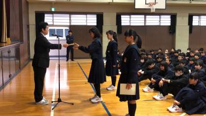 続いて、大阪市立中学校アンサンブルフェスティバルで金管八重奏、木管八重奏、打楽器三重奏で、それぞれ銀賞を受賞した吹奏楽部に、学校長から表彰状が授与されました。