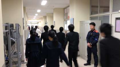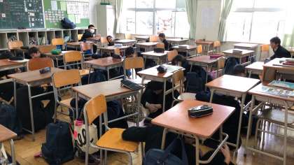地震発生を知らせる非常ベルで机の下に隠れてしばらく待機し、続いて、津波警報の緊急放送で3年生は各クラスの指定された3階廊下に移動しました。