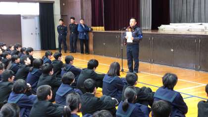 その後、津波警報の解除とともに全員が体育館に避難しました。体育館では、都島消防署の方から避難訓練全体に関する講評、防災にかかわるお話をしていただきました。