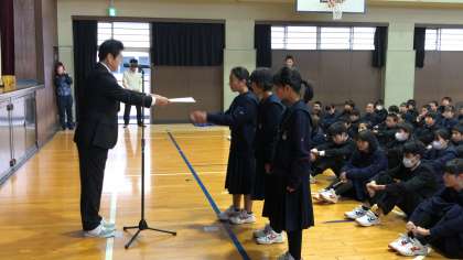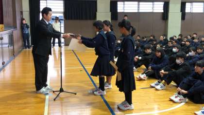 始めに、12月9日(日)に行われた大阪市第2ブロック卓球部1年生交流大会・女子団体の部で優勝したした卓球部の伊地知さん、上田さん、西村さんに学校長から表彰状と盾が授与されました。