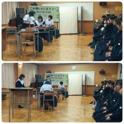 発表作品は秋の大阪府中学校演劇祭で優良賞をいただいた「伝えたかった言葉」です。40名近い生徒・先生方が集まる中、午後3時40分から劇が始まりました。