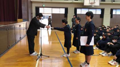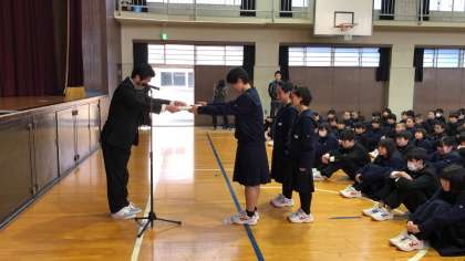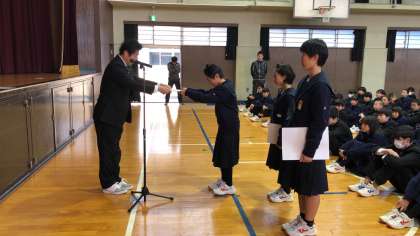 続いて、12月29日に行われたKOUBUNCUP2018バスケットボール選手権大会で優勝した女子バスケットボール部、同大会で最優秀選手に選ばれた1年・大田さん、優秀選手に選ばれた1年・盛山さんに学校長から表彰状が授与されました。