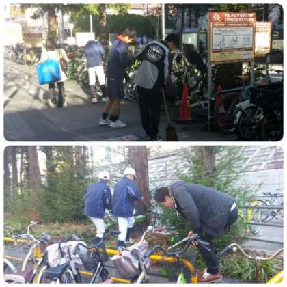 PTA 環境美化委員の皆さんから、思い思いの清掃用具を受け取り、通路の掃き掃除、植え込みや自転車置き場のゴミ拾い、へばり付いたガムの除去などに取り組みました。