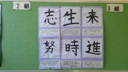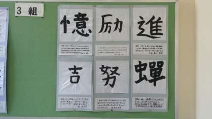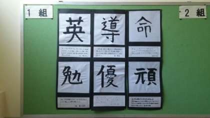 1月11日(金)に行われた1年書初め会の作品が、2階から3階に上がる渡り廊下に掲示されています。