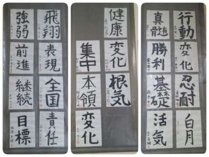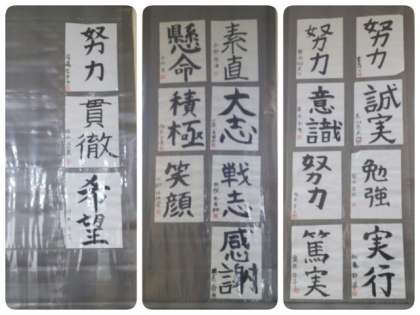2年生全員の作品が掲示されています。一人ひとりの今年への思いが、作品である漢字2文字に込められています。