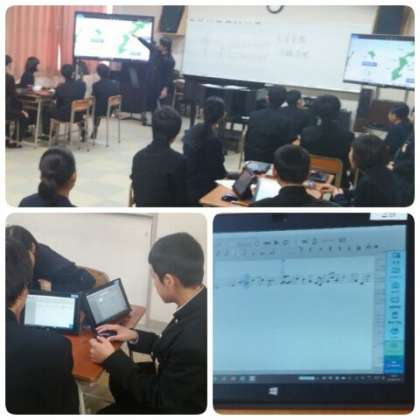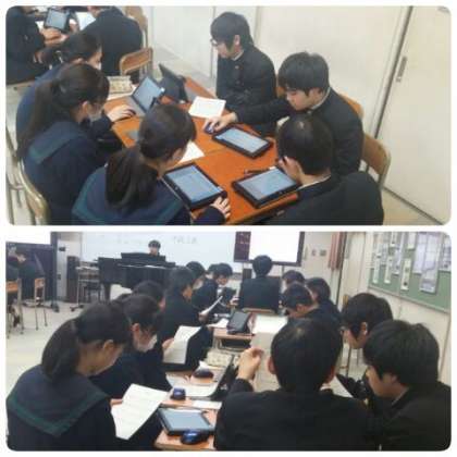 川西先生の指導で、沖縄独特の5音階・沖縄音階について学習し、タブレットを使って沖縄音階の音楽を各自で作曲しました。