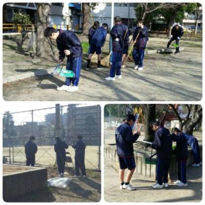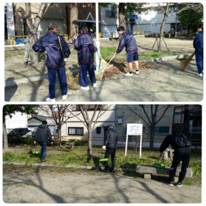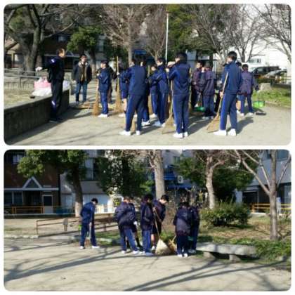 20名ほどの生徒と桜宮連合振興町会長はじめ地域の方々、東都島・桜宮連合の青少年指導員の皆さん、学校元気アップや先生、PTA 役員・実行委員の皆さんで、学校の南側にある桜ノ宮東公園の清掃活動を行いました。