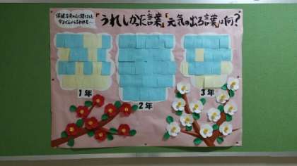 保健委員の人たちが、「ありがとう」や「がんばれ」「おめでとう」「ファイト」「すごい」「最高」「この調子」「いいよ」「めっちゃ助かったわ」など、『うれしかった言葉』『元気の出る言葉』を紅白の梅の花とともに大きな色模造紙に張り付け、中央階段1階から2階へ上がる踊り場に掲示してくれました。