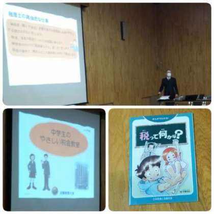 講師には、都島区の税理士・廣田様、旭税務署から池部様を招き、「中学生のやさしい税金教室」と題して、スライドやアニメドラマを見せていただきながら、税の仕組みやその必要性についてわかりやすく説明していただきました。
