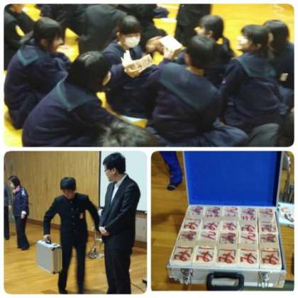 租税教室終了後、税務署から持って来ていただいた一千万円の札束(みほん)を触らせていただきました。最後には、1億円(みほん)の入ったアタッシュケースを持たせていただき、子どもたちにとって貴重な体験をさせていただきました。