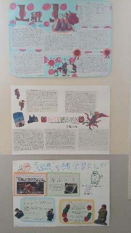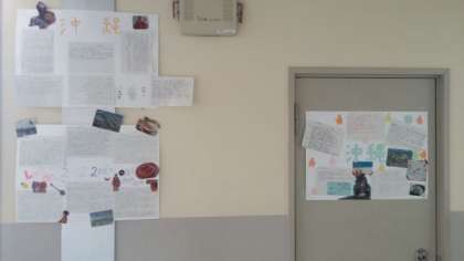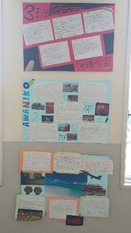 2年生は、沖縄修学旅行に向けて1月後半から取り組んできた、沖縄の「歴史、伝統芸能、言語・文化、音楽、食、基地」について学習してきたまとめを、各クラス各班単位で色画用紙に作成し、学年の廊下に掲示しています。