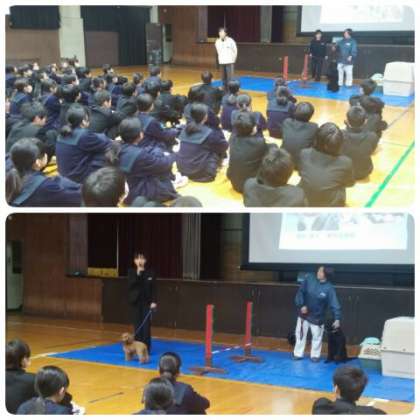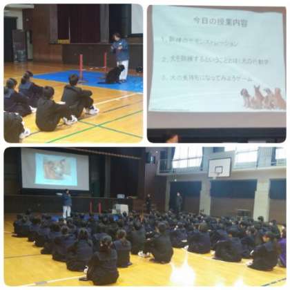 2月15日(金)6時間目、1年生は5時間目の各クラスでの進路学習に続き、体育館において職業講話「ドッグトレーナー出前授業」を行いました。
