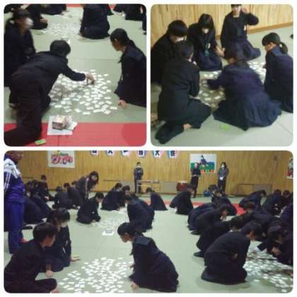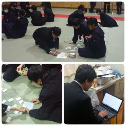 1回戦が終わり、各自が取った札の数を数え、記入用紙に書いて本部に提出です。西川先生がすぐにコンピューターに打ち込み、1回戦の結果が報告されたのち、対戦相手を変えて2回戦が始まりました。