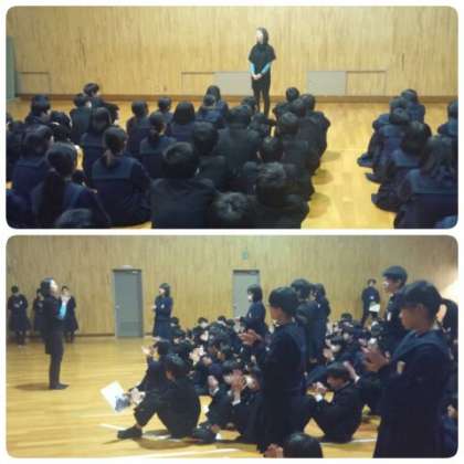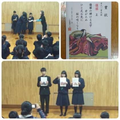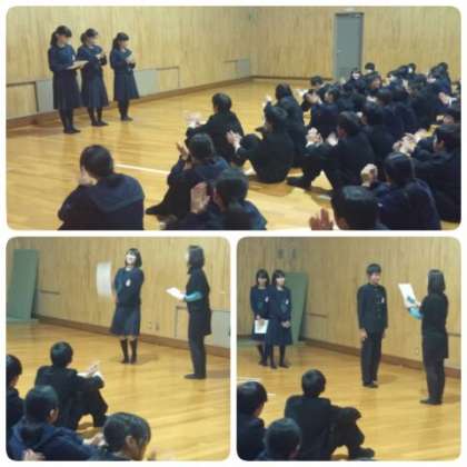 クラス対抗戦の表彰状が学年主任の仲原先生から各クラスの女子委員長に授与されました。最後に、仲原先生から、レベルが上がったこと、太鼓が鳴らなくても静かになりメリハリのある楽しい大会になったことなど、お褒めの言葉がたくさんありました。講評のしめくくりに、壁に掲示した絵を描いてくれた美術部の人たちに、準備から大会運営までしっかり取り組んでくれた国語係の人たちに、全員の拍手で感謝の気持ちを伝えました。