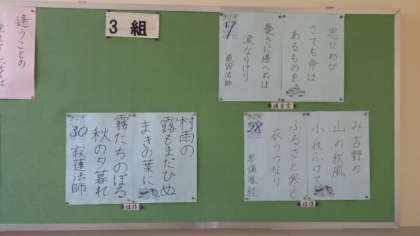 2月26日(火)、2階から3階に上がる階段の渡り廊下に、1年生の百人一首・書道作品の最優秀賞1点、優秀賞2点、佳作5点が掲示されています。