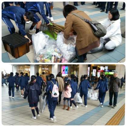 PTA の皆さんがゴミの分別をしていただき、子どもたちが集めたゴミと清掃用具を所定の場所に持っていきました。