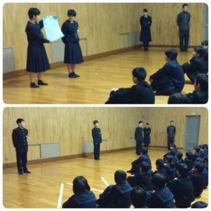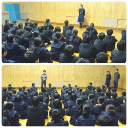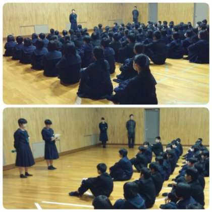 次に、玉村先生から、3月14日(木)の卒業式、4月2日(火)の入学式の代表生徒についての連絡、卒業式の意義などについて話がありました。