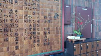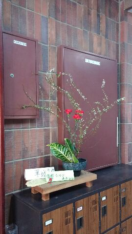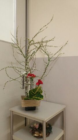 卒業式を前に、茶華道部の子どもたちが「いけばな」の作品づくりに取り組み、カーネーション、クロトン、雪柳を使った作品を玄関と校長室前に飾ってくれました。