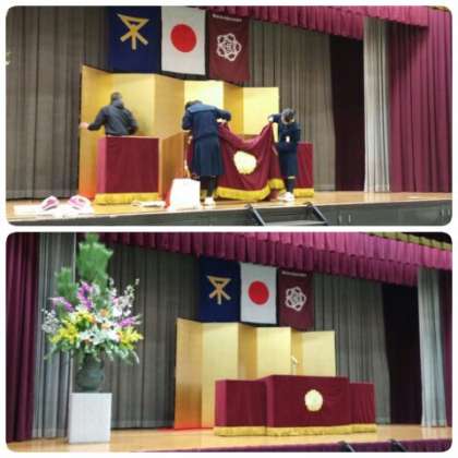 長椅子をメジャーで測った位置にきれいに並べ、来賓用の椅子をならべ、紅白幕を付け、舞台のセッティングをして明日の卒業式の準備完了です。遅くまで準備、ありがとうございました。
