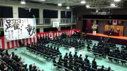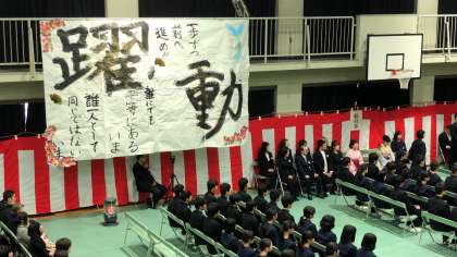 式場内には、3年生が文化祭で書き上げた書道パフォーマンスの作品「躍動」も掲示されました。